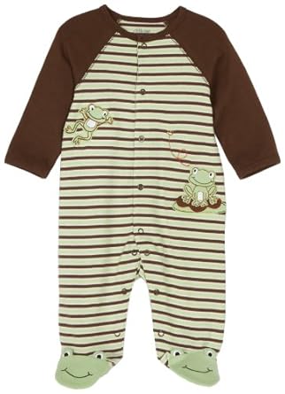 Category: Baby Vendor: This is an adorable footie from little me, the body is multi stripe with brown, light green and white stripes and frog applique